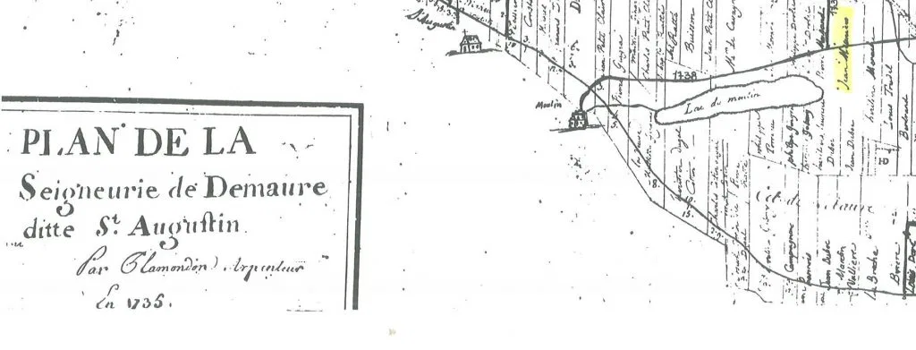 Le plan ci-contre réalisé par M. PLamondon, arpenteur en 1735, montre le lac Saint-Augustin qui s’appelait alors, le lac du Moulin, le moulin banal et le lien au fleuve.