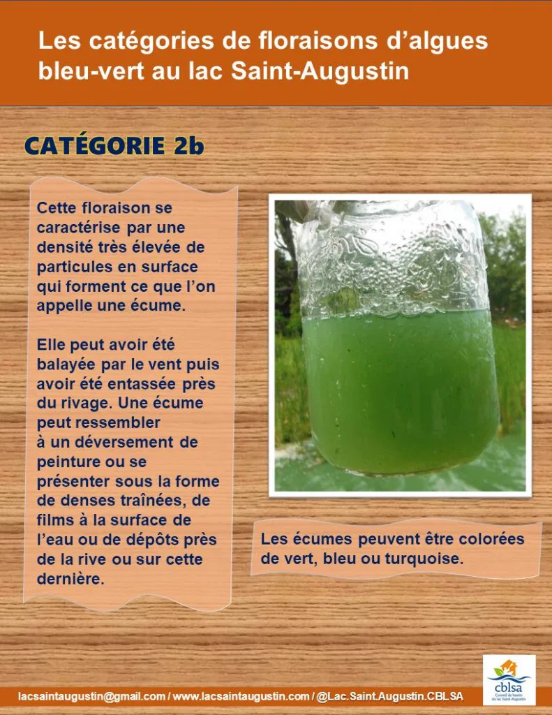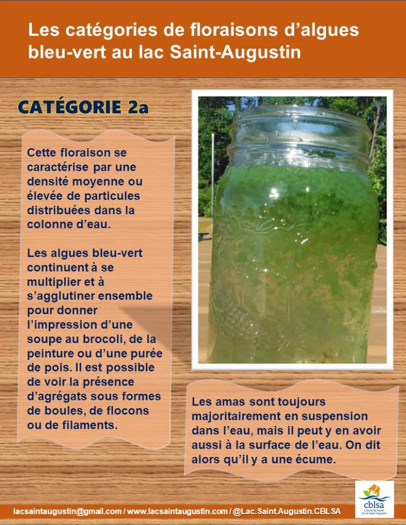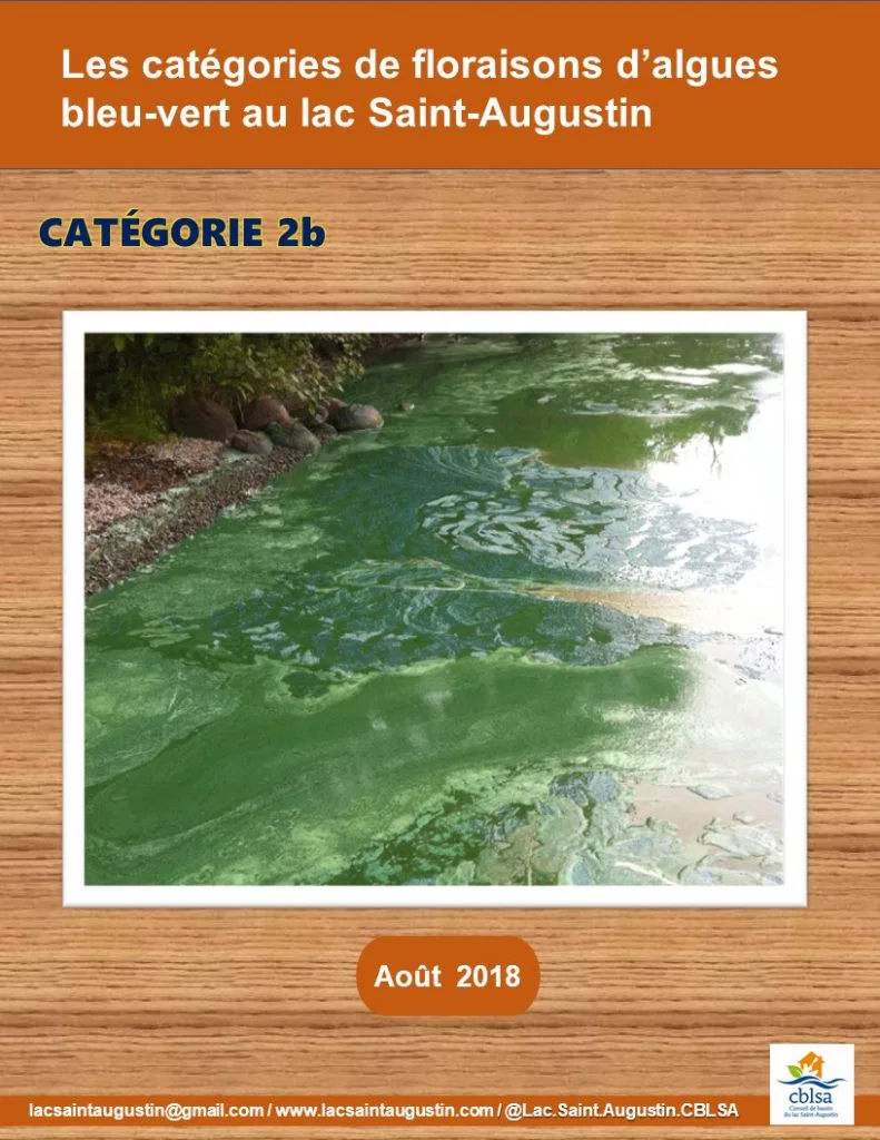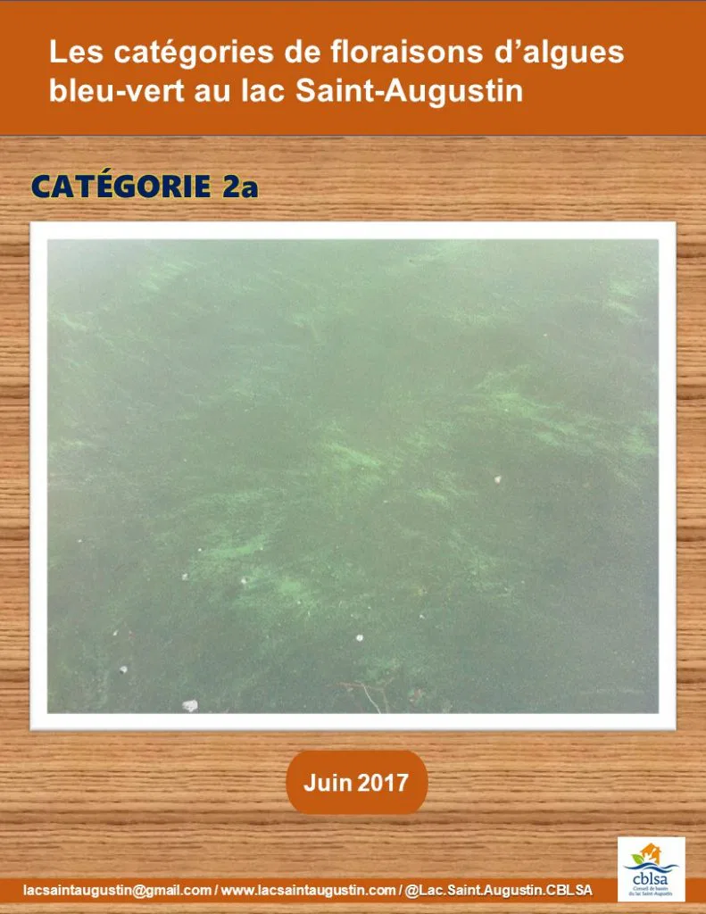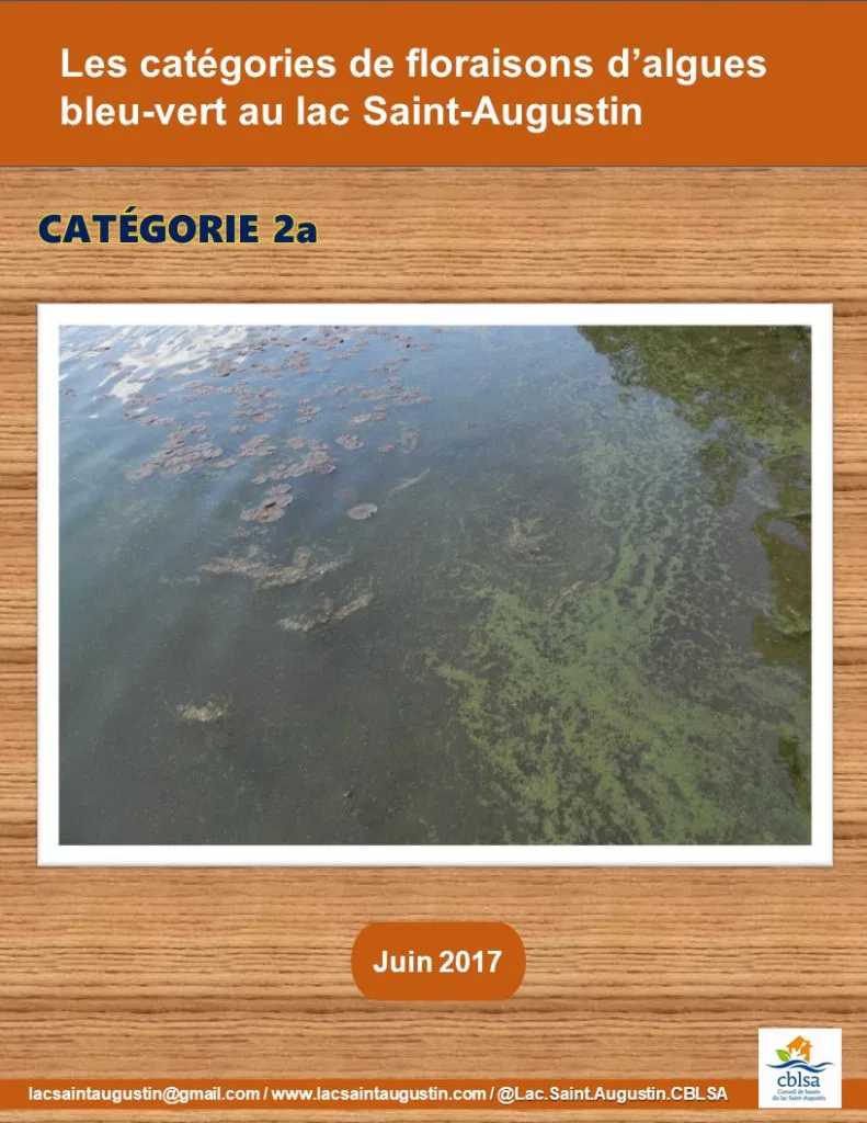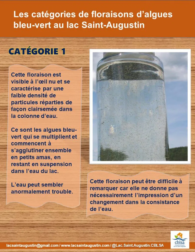 On a noté une floraison de catégorie 1 au lac Saint-Augustin le 20 juin dernier. Sachez comment reconnaître les 3 catégories de floraisons d’algues bleu-vert.