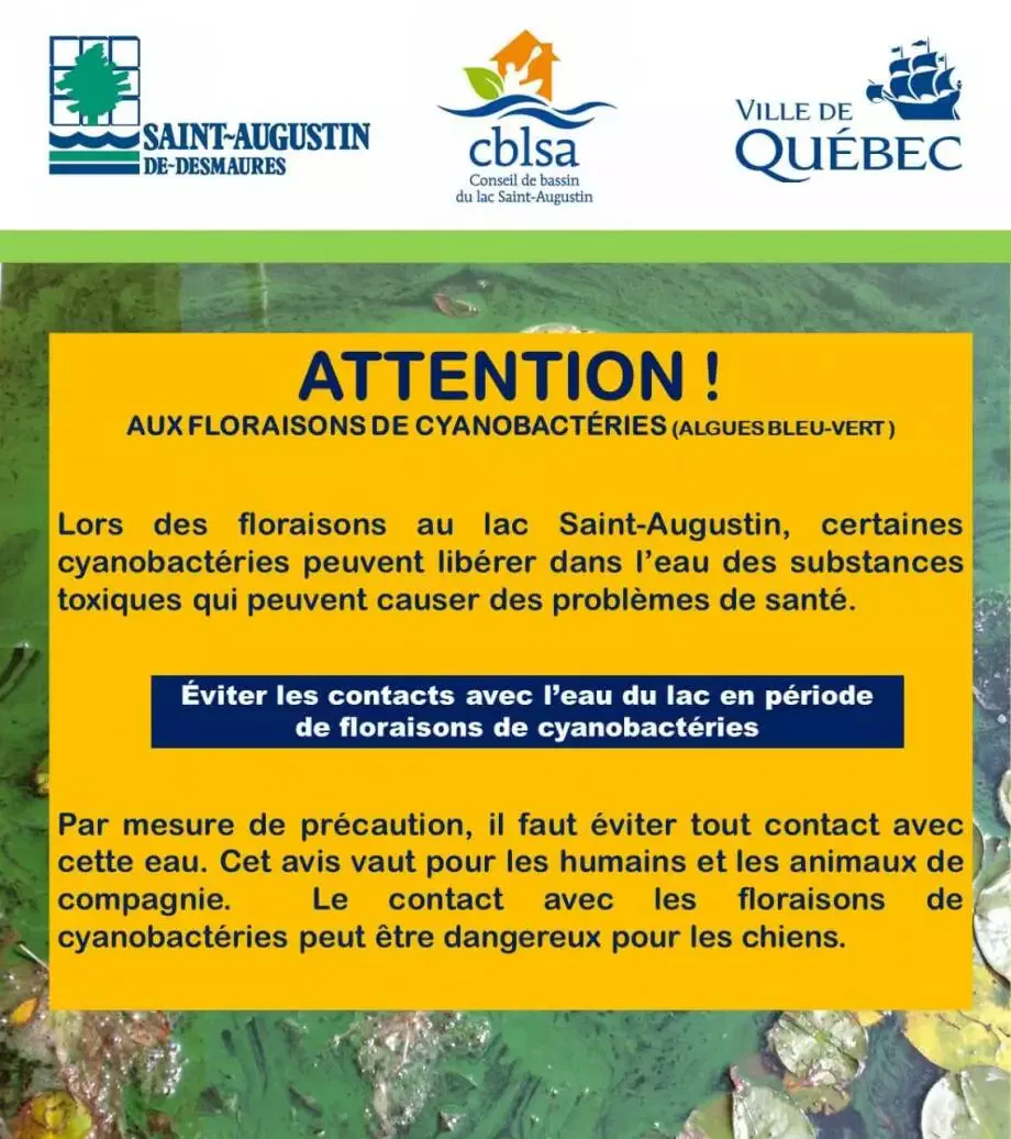 Août, le mois des cyanobactéries au LSA Le mois d’août commence en force avec une floraison de catégorie 2b,où les algues bleu-vert s’agglutinent à la surface de l’eau pour former une soupe de couleur verte aux reflets bleutés. Attention ! Ces cyanobactéries peuvent produire des cyanotoxines dangereuses pour la santé humaine et animale.