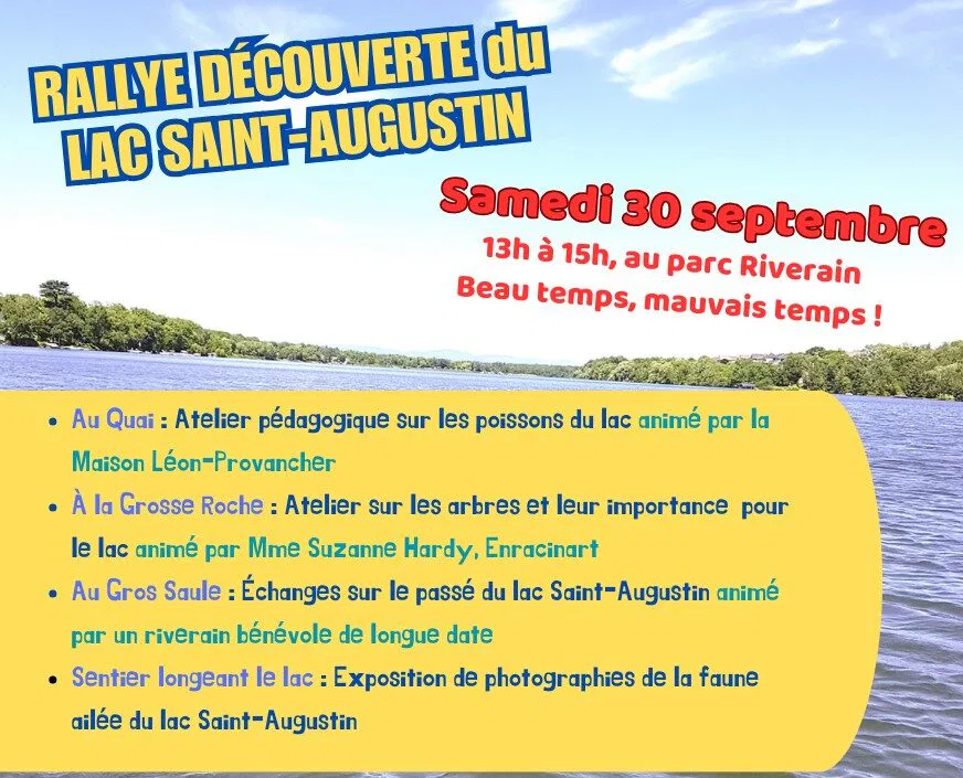 Le CBLSA vous invite à la 3e édition du Rallye-Découverte du lac Saint-Augustin, le samedi 30 septembre de 13h à 15h au parc Riverain. Le parcours de découverte débute dans le sentier partant du stationnement en direction du lac. Au Quai : Atelier pédagogique sur les poissons du lac, animé par la Maison Léon-Provancher À la […]