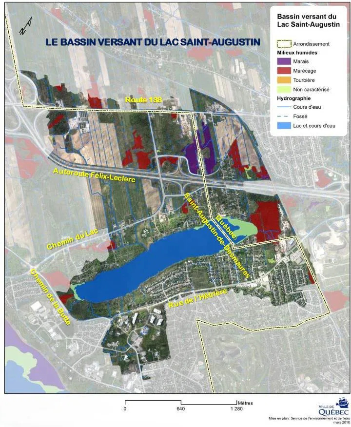 Le bassin versant représente le territoire sur lequel toutes les eaux de pluie tombent puis s’écoulent vers un même point, le lac St-Augustin.