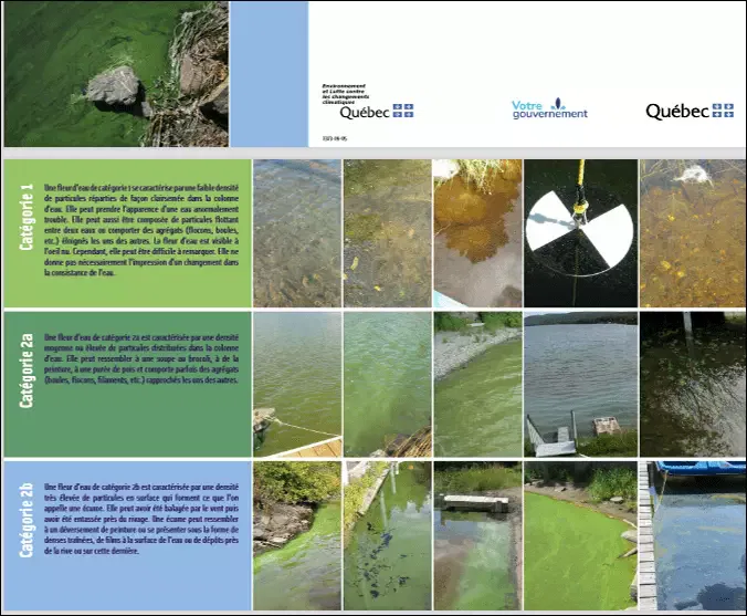 Le ministère de l’Environnement et de la Lutte contre les changements climatiques (MELCC) a mis en ligne un portait d’information au sujet des cyanobactéries ou algues bleu-vert, où il nous encourage à identifier la catégorie dans laquelle se classe les floraisons d’algues bleu-vert.