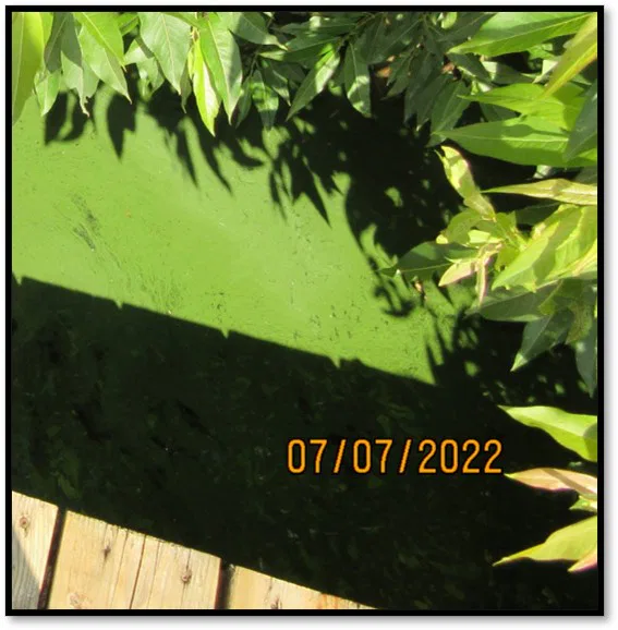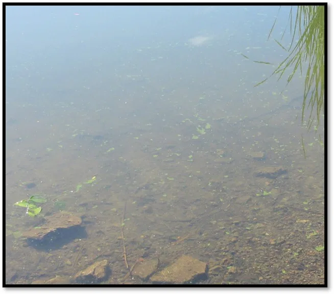 CATÉGORIE 2a : Elle se caractérise par une densité plus élevée d’amas d’algues bleu-vert distribués dans la colonne d’eau. Ces amas sont plus rapprochés les uns des autres. L’eau ressemble à une purée de pois.