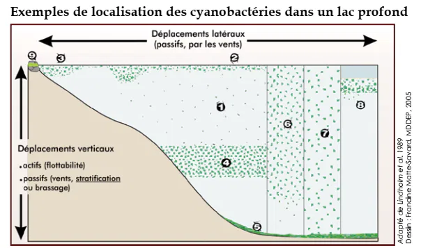 3 Écume de surface accumulée près du rivage ou dans une baie en raison du vent. 4 Fleur d’eau dans la couche d’eau intermédiaire (habitat préféré pour certaines espèces). 5 Accumulation de cyanobactéries sur les sédiments. 6 Dispersion sur toute la portion supérieure de la colonne d’eau durant le début du brassage automnal des eaux. 7 Dispersion sur toute la colonne d’eau durant le plein mélange des eaux au printemps (lorsque le lac « cale ») et à l’automne (lorsque les eaux refroidissent). 8 Concentration sous la couche de glace. 9 Dépôt d’écume sur le rivage pouvant résulter d’une baisse du niveau des eaux du plan d’eau ou bien pouvant avoir été apporté par les vagues.