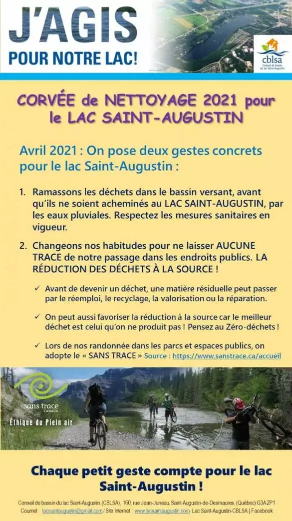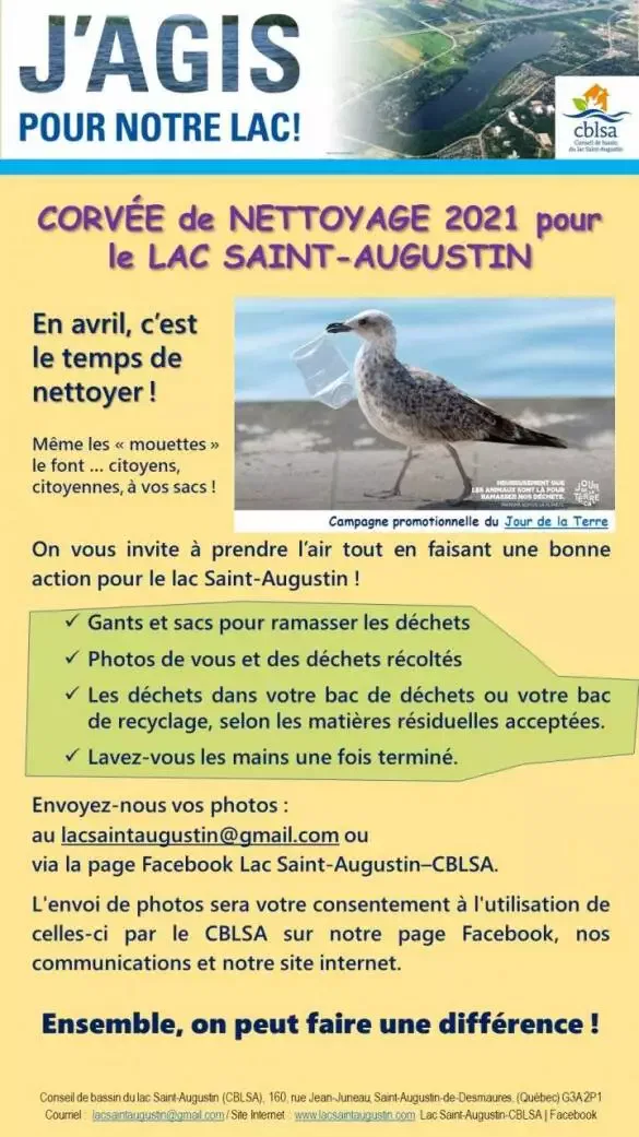 En 2021, la corvée annuelle de nettoyage pour le lac Saint-Augustin est devenue virtuelle et a été lancée le Jour de la Terre (22 avril). Des gens en solo, en famille ou en petits groupes sont passés à l’action ! Voici les trois annonces de la Corvée de nettoyage 2021 pour le lac Saint-Augustin.
